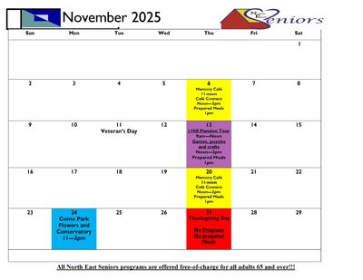 North East Seniors will be closed on Thanksgiving Day. There will be no programs on Thursday, November 27th. There will be no meals distributed on Thanksgiving.